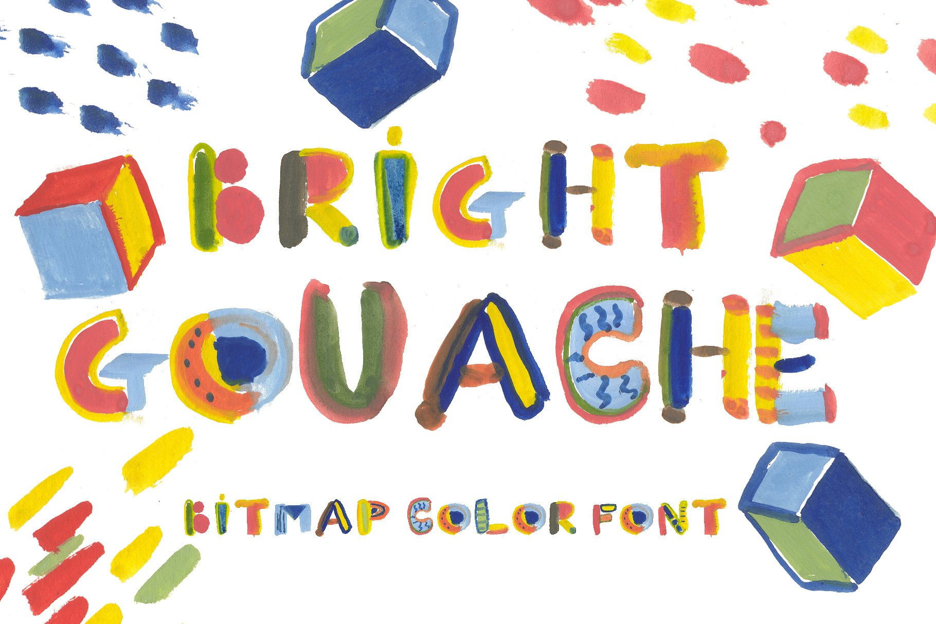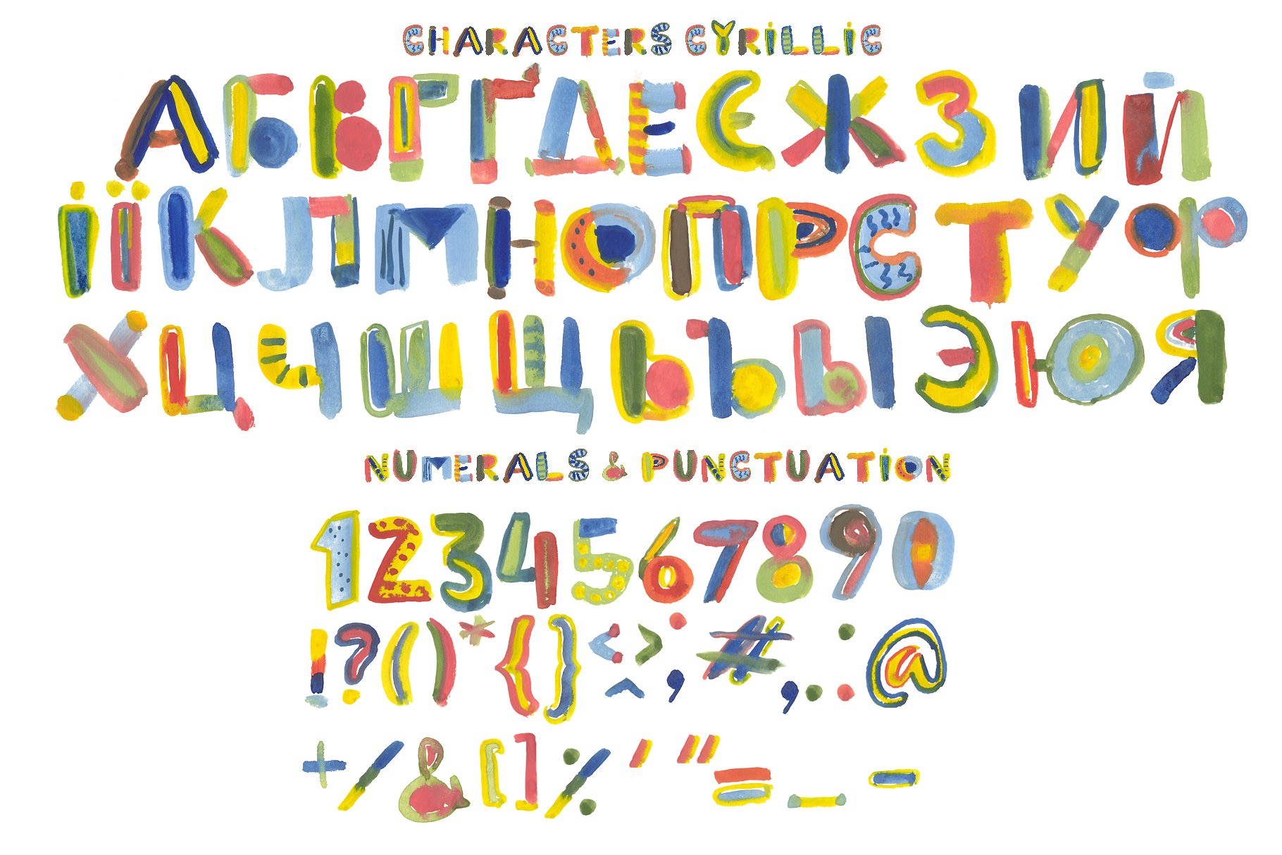 Bitmap OpenType-SVG font – BRIGHT GOUACHE with Latin and Cyrillic letters! BRIGHT GOUACHE font contains Latin letter and Cyrillic letter set, numerals and punctuation. This font work nicely for all sorts of things including t-shirt design, typographic art, children products, social media images and so much more!