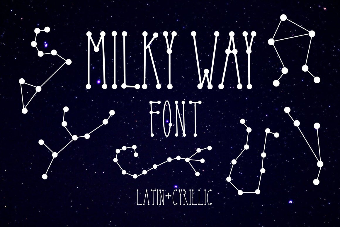 New space font – MILKY WAY with latin and cyrillic letters! MILKY WAY font contains latin and cyrillic letter sets, numerals and punctuation. This font work nicely for all sorts of things including t-shirt design, typographic art, social media images and so much more!